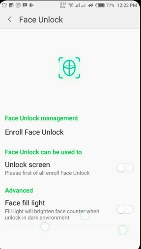 - Now, you can now open your locked phone at a very high speed using your face pointing to the frontal camera. You can also use Face Fill Light feature to brighten face counter when unlocked in a dark environment.